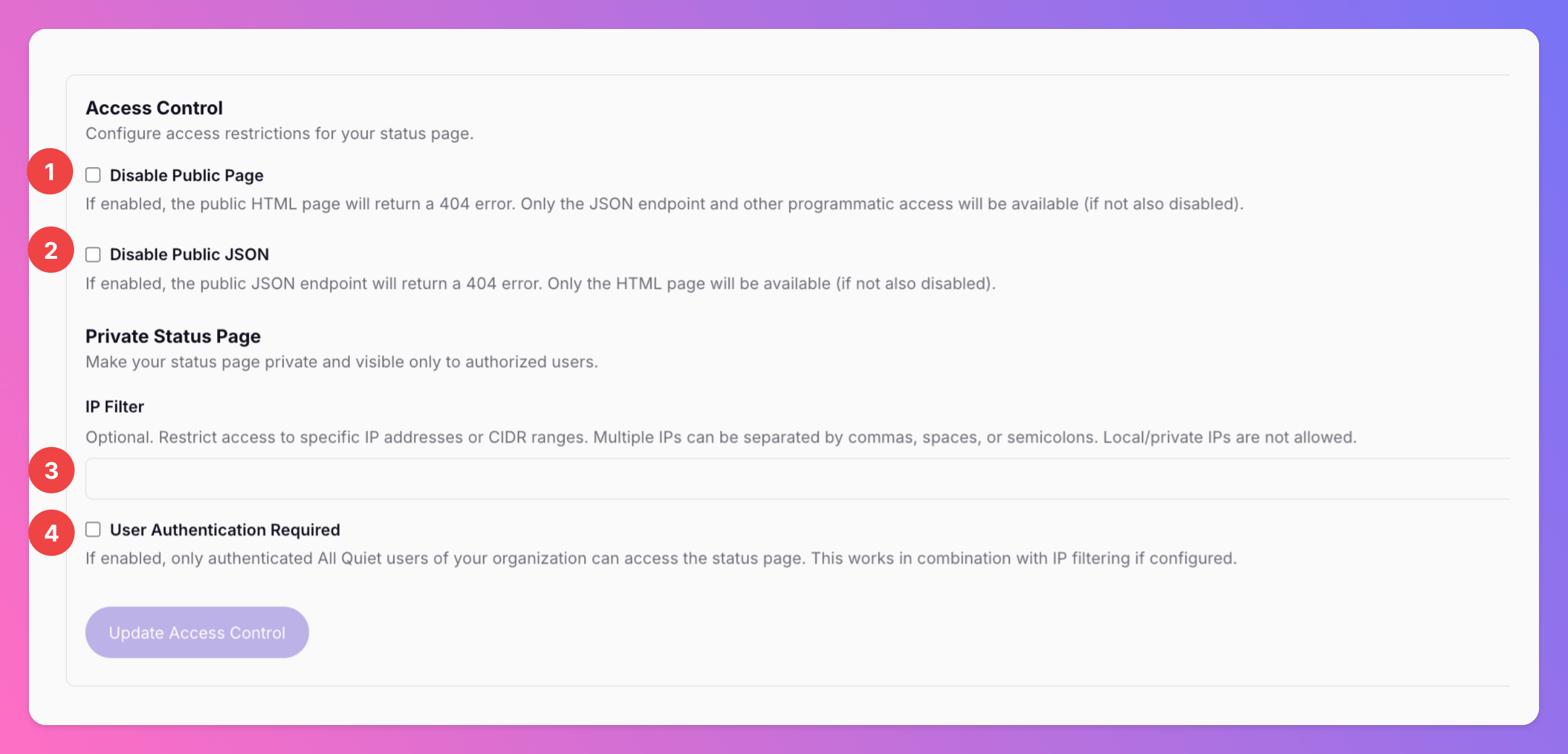 IP Filterto restrict access to specific IP addresses or CIDR ranges and make the status page private. - Activate