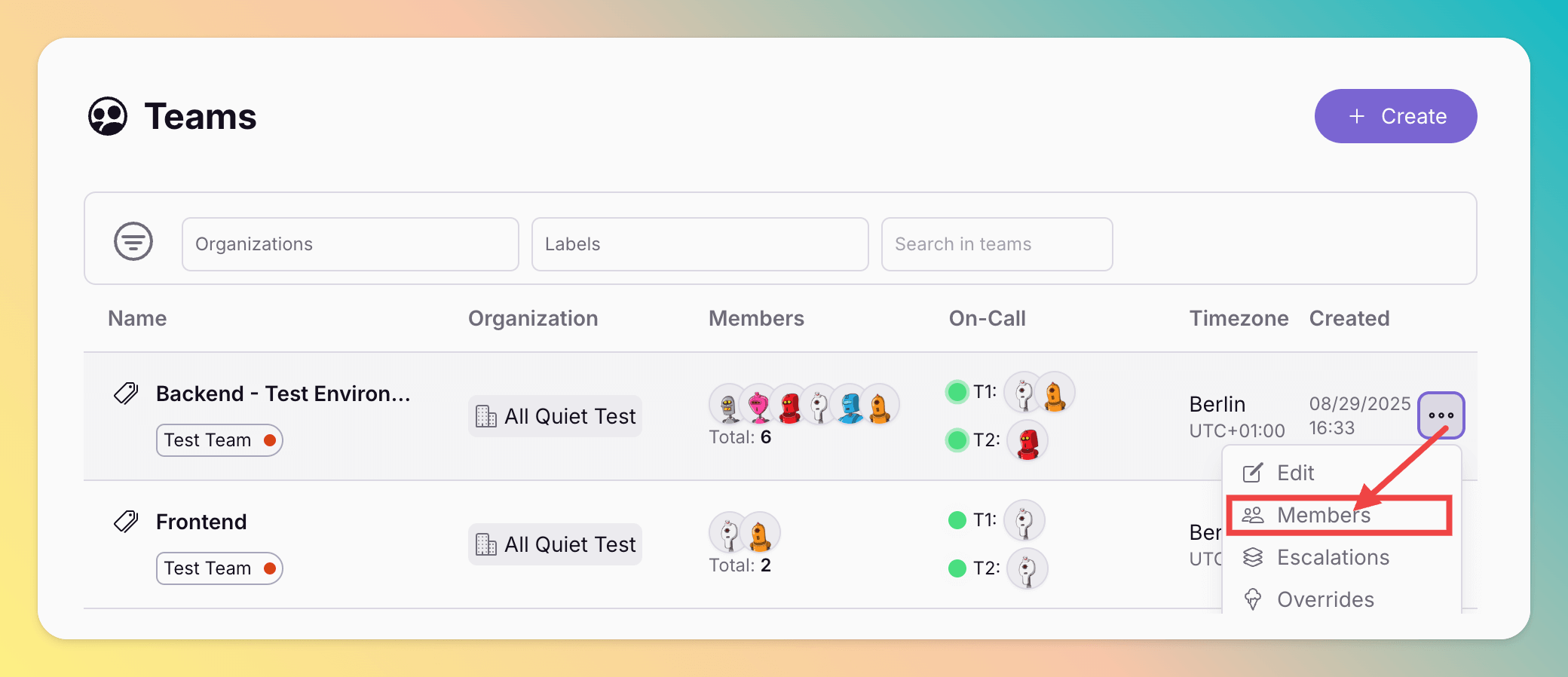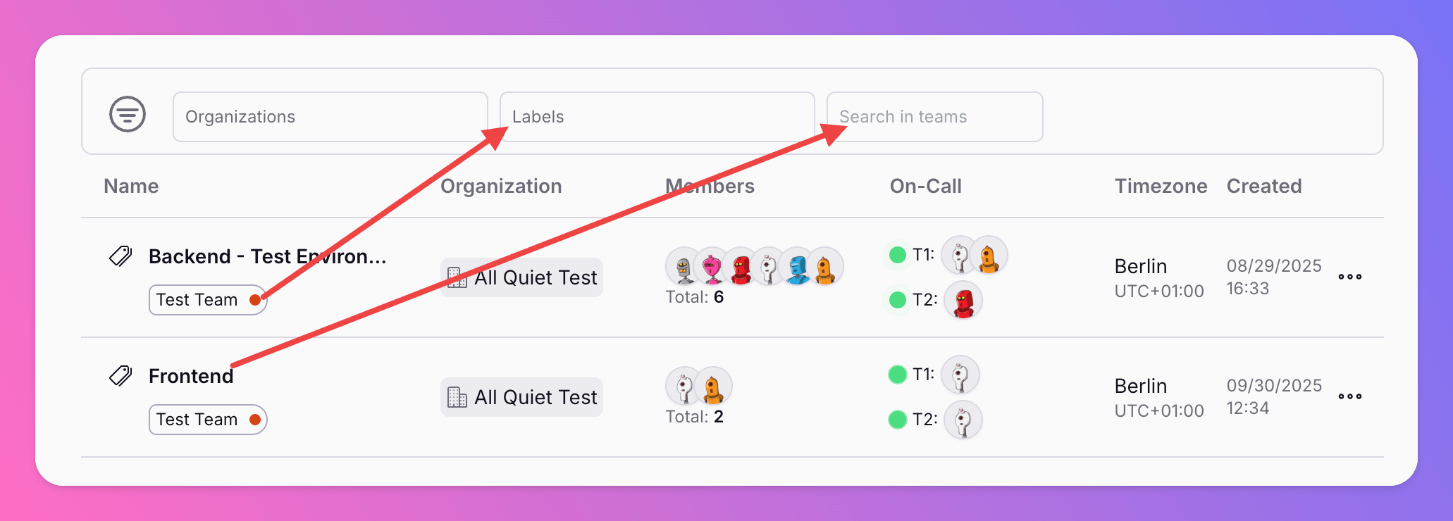 Labels. This is handy if you want to organizae your teams into categories, e.g. departments or business units. You can use the labels to filter incidents, integrations and your team overview. - Hit
